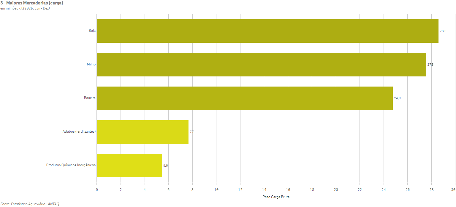 As mercadorias com maior volume de movimentação no Pará em 2025 foram a soja, com 28,6 milhões de toneladas, seguida pelo milho (27,5 milhões de toneladas) e pela bauxita (24,8 milhões de toneladas). Na sequência aparecem os fertilizantes, com 7,7 milhões de toneladas, e os produtos químicos inorgânicos, que somaram 5,5 milhões de toneladas.