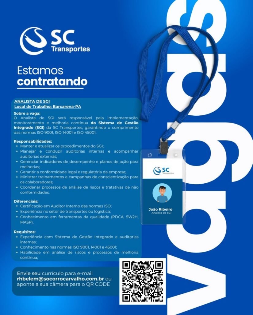monitoramento e melharia continua do Sistema de Gestão Integrado (SCI) da SC Transportes, garantindo o cumprimento das normas ISO 9001, ISC 14001 e ISO 45001