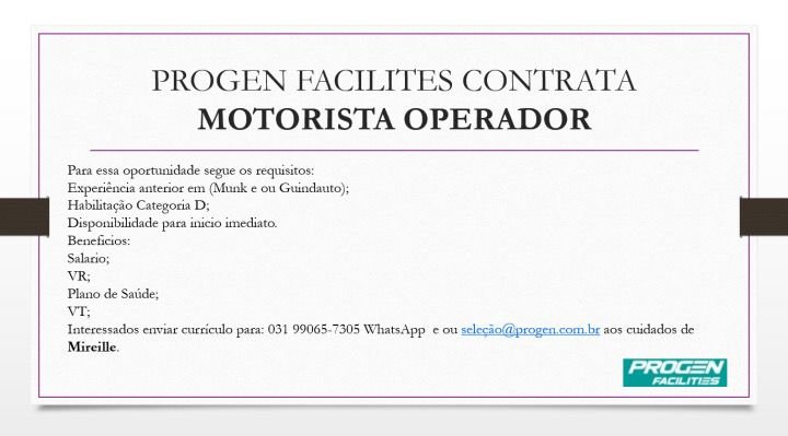 Interessados podem enviar para o whatsApp: 031 99065-7305 ou para selecao@progen.com.br ao cuidados de Mireille