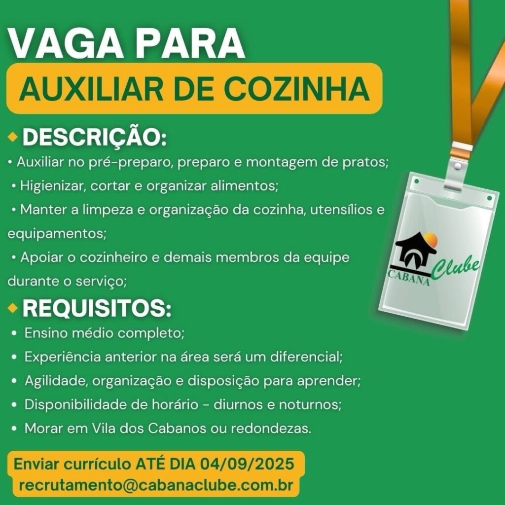 VAGA: PARAAUXILIAR DE COZINHA – Cabana Clube